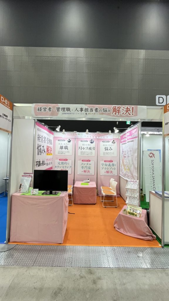 今回のテーマは、「働く人と企業を“心の健康”から支える新しい形」。介護や子育てとの両立を支援するパートナー企業との協業を通じて、経営者・従業員・家族を包括的にサポートする仕組みを紹介しました。働き盛り世代が直面する介護や育児の課題は、企業にとって避けて通れないテーマです。ブースでは、職場での両立支援体制づくりや、オンライン相談の導入による負担軽減の具体的な事例を紹介し、多くの来場者が熱心に耳を傾けてくださいました。