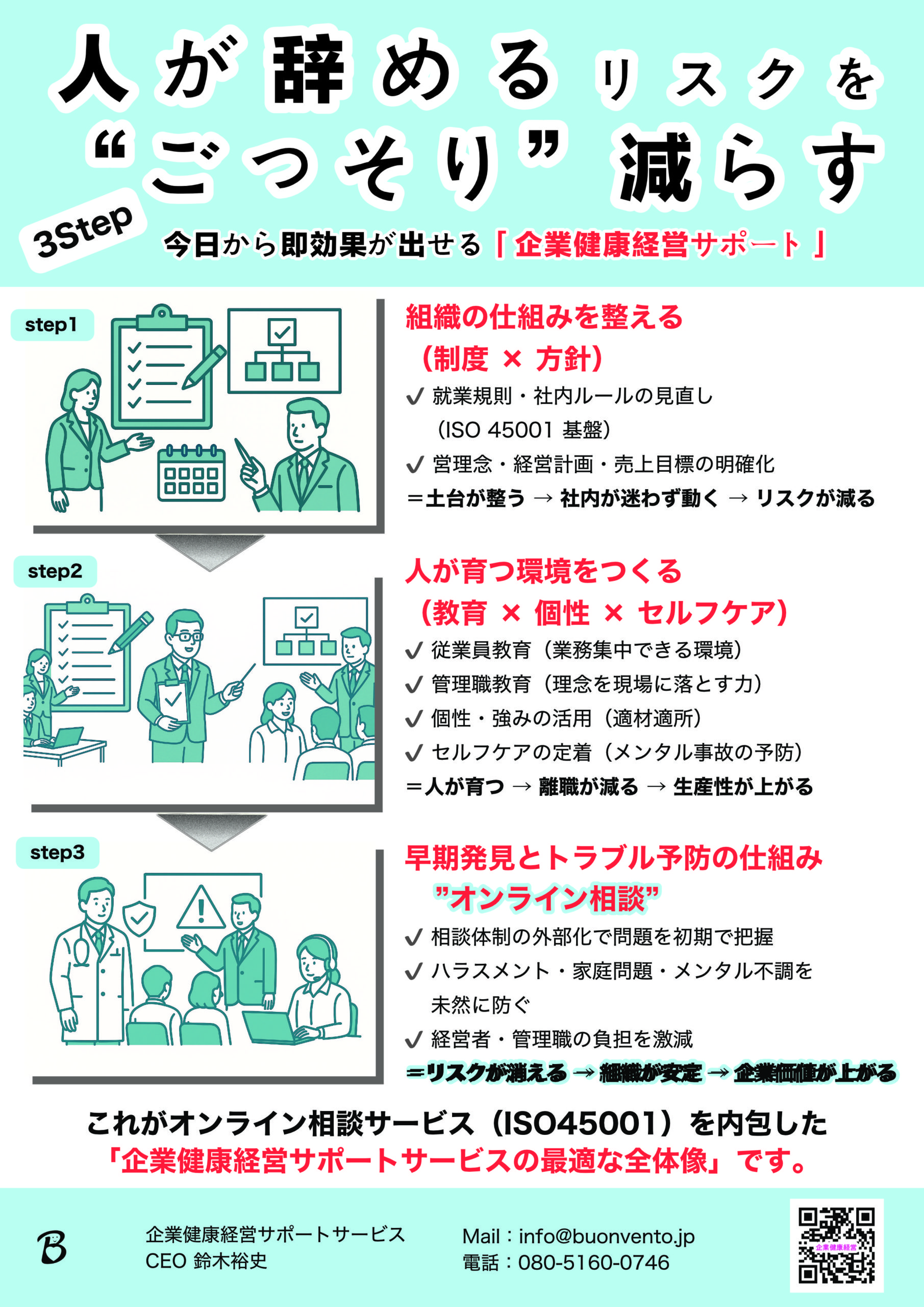 経営者・管理職はメンタルの専門家ではないので、従業員や部下のメンタルを気遣って行くにも時間的な限界があったりします。この限界になってしまう部分を外部サポート企業が一緒に運営して皆様のメンタルを安定して維持できる様サポートします。