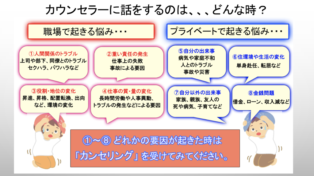 - カウンセリングは“支援”ではなく“一次予防”セルフケアに繋げることです。